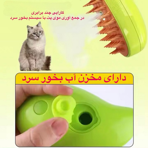 برس شارژی دارای بخور سرد و دندانه های تمام سیلیکونی قابل جداسازی جهت شانه کردن موی پت و جمع آوری آن که روش مناسبی جهت حل مشکل هربال در حیوانات خانگی است.