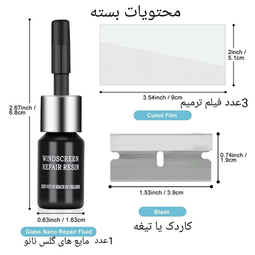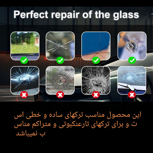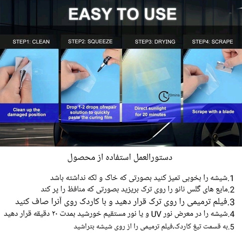 روش استفادهابتدا ترک شیشه را از هرگونه آلودگی و خاک پاک کنید ،سپس مایع های گلی را روی ترک بریزید و بلافاصله فیلم ترمیمی را روی آن بچسبانید و با کاردک موجود در بسته آنرا کاملا صاف کنید،بعد از آن شیشه را در معرض نور UV و یا نور مستقیم خورشید بمدت ۲۰-۳۰ دقیقه قرار دهید و سپس فیلم ترمیمی را با استفاده از تیغه کاردک موجود در بسته ،کاملا بتراشید.