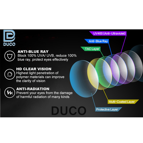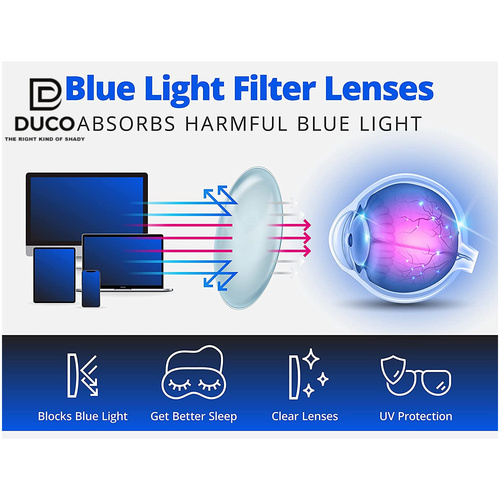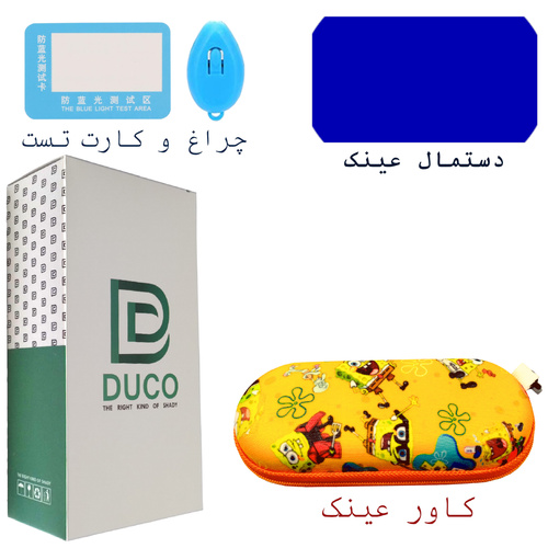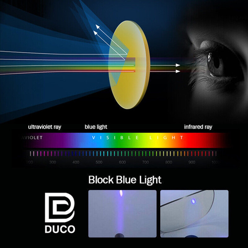 عینک محافظ چشم Duco Kids دارای عدسی بلوکات بوده و پرتو های طیف ‌Blue Light را حذف میکند. این پرتو ها توسط نور های مصنوعی مانند لامپ و LED و صفحه های نمایش موبایل و کامپیوتر ایجاد شده و علاوه بر خستگی زود هنگام چشم موجب سردرد، اختلال در خواب، سوزش چشم و مشکلاتی دیگر میگردد.