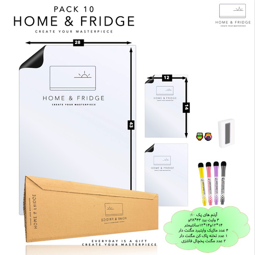 مجموعه تخته های وایت برد مغناطیسی انعطاف پذیر HOME & FRIDGE به همراه بسته چهار تایی ماژیک مخصوص مگنت دار، یک تخته پاک کن و دو عدد مگنت رویخچالی می باشد که شما با یک سفارش این مجموعه 10 عددی را دریافت می کنید.