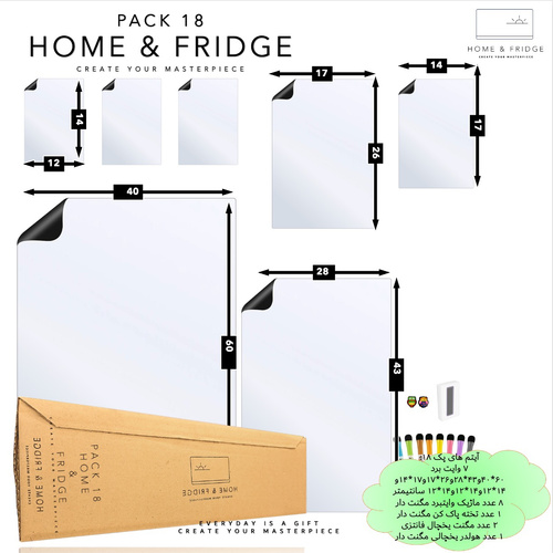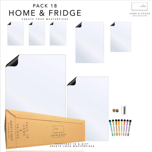 مجموعه وایت برد مغناطیسی انعطاف پذیر HOME & FRIDGE به همراه بسته هشت تایی ماژیک مخصوص مگنت دار و پاک کن و پک دو عددی استیکر مگنت رویخچالی ارائه می گردد.شما با یک سفارش این مجموعه 18 عددی را دریافت می کنید. کاربرد این وایت برد بسیار وسیع است و در خانه و آشپزخانه، مهدهای کودک، مدارس، ادارات و شرکت ها، جهت نوشتن و پاک کردن مداوم و استفاده دائمی در طولانی مدت طراحی شده است. هم چنین برای فعالیت های آموزشی داخل خانه و یا نقاشی کودکان نیز فوق العاده است. طراحی منحصر به فرد این محصول با رویکرد مینیمال در عین سادگی با دقت انجام شده است.