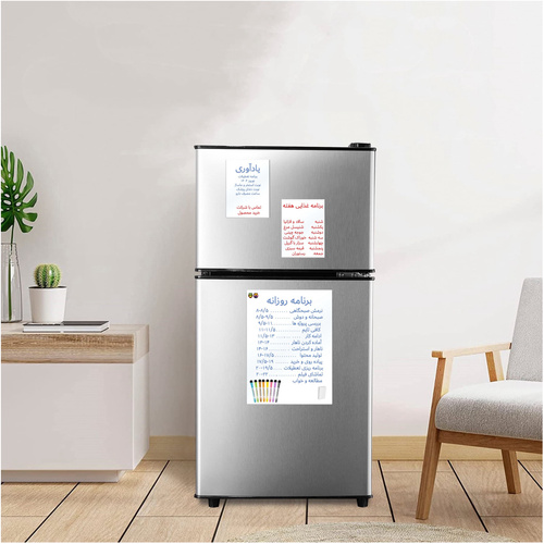 سایر توضیحاتراهنمای نصب و نگهداری: ۱- جهت نصب این وایت برد، ابتدا سطح مورد نظر (مثلا يخچال) و همچنین سطح پشت وایت برد را با یک دستمال نرم، تمیز نموده و سپس خشک نمایید. ۲- جای اتصال وایت برد را روی سطح یخچال بصورت چشمی در نظر بگیرید و وایتبرد را با دو دست از بالا گرفته، روی سطح از بالا بچسبانید و رها کنید تا مگنت پشت آن به سطح بچسبد. ۳- برای نصب بروی سطوح غیر آهنی، چند قطعه چسب دوطرفه یا چسب مایع معمولی به پشت آن بچسبانید و براحتی روی سطح نصب نمائید. توصیه به سوراخ کردن با میخ و پیچ و منگنه و ... نمی شود. ۴- لایه ای برای محافظت از صفحه روی آن کشیده شده است که به محض نصب روی سطح مورد نظر، روکش را به آرامی با دست جدا کنید تا صفحه براق نمایان شود و سپس شروع به استفاده کنید. ۵- همراه این محصول، ۱ عدد ماژیک وایتبردی مخصوص نوشتن و پاک کردن وایتبرد است که یدک یا جوهر شارژ مجدد آن هم معمولا با جستجو در دیجیکالا یافت می شود. ۶- برای تمیز کردن این وایت برد نیاز به الکل یا هرگونه شوینده دیگری نیست و براحتی با ابر انتهای ماژیک می توانید آن را پاک کنید. فقط نوشته های روی صفحه باید خشک شده باشند. ۷- برای تمیز کردن کامل صفحه، هر چند هفته یک بار می توانید با یک عدد دستمال نرم یا یک ابر نرم آن را کاملا پاک کنید تا مانند روز اول سفید شود. ۸- از ضربه زدن با هر شیئ تیز یا خش انداز مانند خودکار و مداد و چکش و ... روی آن جدا خودداری کنید تا دوام و طول عمر بالای این محصول حفظ گردد و از تا زدن و تکه کردن آن نیز پرهیز کنید. * متریال سطح این محصول از جنس وایت برد Dry Erase P.E.T Film است که با یک لایه نانو پوشیده شده تا به راحتی قابل نوشتن، پاک کردن و نوشتن مداوم برای طولانی مدت باشد. * سطح پشت وایتبرد به طور کامل با متریال Ferrite Powder & Elastomer Composite پوشش داده شده تا بدون لغزش روی یخچال و سطوح آهنی مشابه بچسبد و همچنین با حفظ انعطاف پذیری مناسب، دچار ترک و شکستگی نشود.