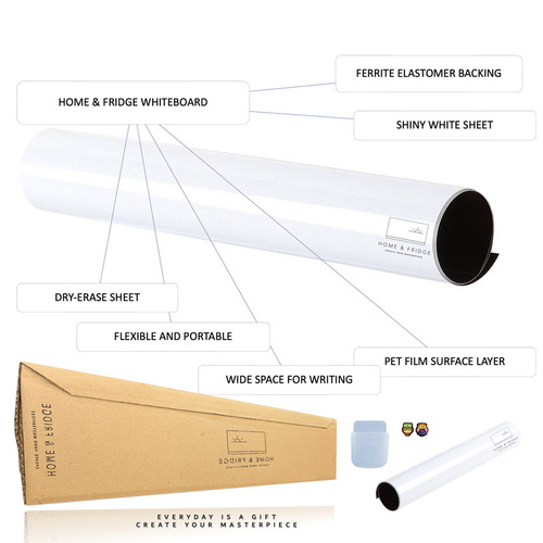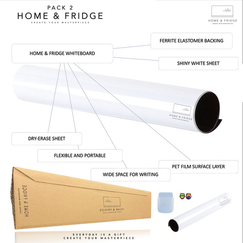 تخته وایت برد مغناطیسی انعطاف پذیر HOME & FRIDGE به همراه هولدر و پک دو عددی مگنت رویخچالی ارائه می گردد. کاربرد این وایت برد بسیار وسیع است و در خانه و آشپزخانه، مهدهای کودک، مدارس، ادارات و شرکت ها، جهت نوشتن و پاک کردن مداوم و استفاده دائمی در طولانی مدت طراحی شده است. هم چنین برای فعالیت های آموزشی داخل خانه و یا نقاشی کودکان نیز فوق العاده است. طراحی منحصر به فرد این محصول با رویکرد مینیمال در عین سادگی با دقت انجام شده است. دیگر نگران فراموش کردن امور روزمره و کارهایتان نباشید؛ میتوانید از این وایت برد برای برنامه ریزی کارهای روزانه، هفتگی و یا حتی ماهانه استفاده کنید.