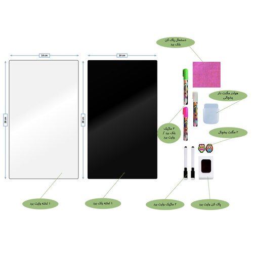 وایت برد یخچالی مغناطیسی هوم اند فریج بهمراه بلک برد مدل دوقلو سایز 28x14 سانتیمتر + ماژیک, هولدر مغناطیسی، مگنت یخچالی، دستمال