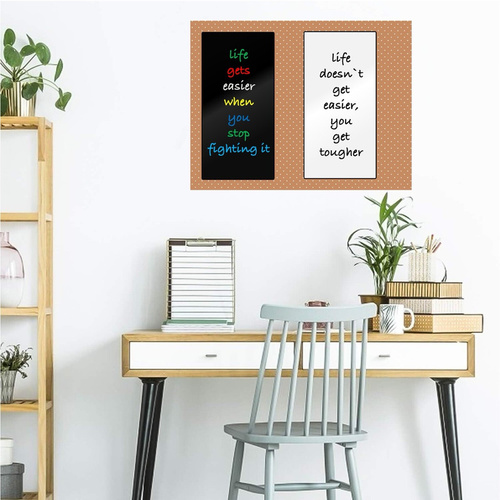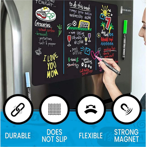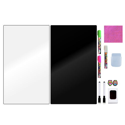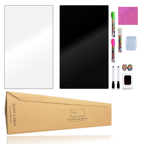 وایت برد و بلک برد مغناطیسی انعطاف پذیر HOME & FRIDGE محصولی فوق العاده پر کاربرد است که هم تخته سیاه و هم تخته سفید را به همراه تمام ملزومات مورد نیاز در یک مجموعه 12 عددی در اختیار شما می گذارد. این محصول شامل 2 تخته مغناطیسی انعطاف پذیر در رنگهای سفید و مشکی، به همراه سه عدد ماژیک گچ مایع وایت بردی، دو عدد ماژیک وایت بردی مشکی، یک دستمال بعنوان پاک کن، فوم تخته پاک کن جادویی، هولدر یخچالی مگنت دار و پک دو عددی استیکر مگنت رویخچالی ارائه می گردد.