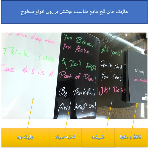 بنابراین فقط باید پیش از هربار استفاده ماژیک ها را بخوبی تکان دهید و پس از اتمام کار، تخته ها را بشویید یا با دستمال پاک کنید. این ماژیک بر پایه آب است و حتی میتونید از اون برای نقاشی و نوشتن روی انواع سطوح صاف مثل شیشه و آینه،بدنه و شیشه خودرو و... استفاده کرد. همچنین میتوانید نوک ماژیک را در آورده و برعکس جا بزنید و نوک آنرا از گرد به زوکی شکل تغییر دهید. همچنین یک هولدر یا نگهدارنده مگنت دار یخچالی برای جای دستمال و ماژیک، به همراه این پکیج می باشد. شما می توانید از این وایت برد / بلک برد برای استفاده در منزل،محیط کار،فروشگاهها،مدارس،کافی شاپ ها و سایر مکانها استفاده کنید.