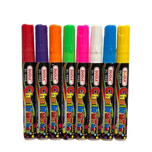ماژیک 8 عددی Duole LED HIGHLIGHTER با جوهر گچ مایع یا liquid chalk در رنگ های درخشان و فلورسنت است که برای نقاشی و یا نوشتن، ایده آل برای تمامی رده های سنی از کودک تا بزرگسال می باشد. این محصول در رنگ های مختلف فلورسنت که همگی براق هستند، تجربه منحصر بفردی برای کاربر به همراه دارد. ماژیک های گچی مایع که به ماژیک گلس برد نیز معروف هستند، از نوع WET-ERASE می باشند؛ به این معنا که برای پاک کردن باید از دستمال خیس یا مرطوب استفاده شود.