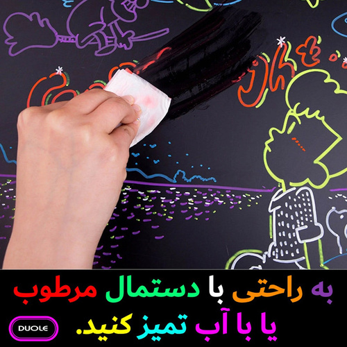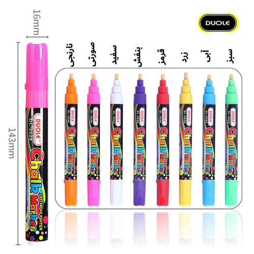 در نتیجه به راحتی با آب شسته می شوند و شما برای پاک کردن آنها از سطوح LED, شیشه ای یا وایت برد و پلکسی تنها به آب و دستمال خیس نیاز دارید. کار کردن با ماژیک های گچی Duole، بر روی سطوح مختلف، تجربه ای متفاوت و خلاقانه را در اختیار کودکان و سایر کاربران این محصول قرار می دهد. این ماژیک کاملا بدون بو و بدون حساسیت و برای استفاده کودکان کاملا بی خطرمی باشد و گزینه مناسب و جذابی برای ایجاد علاقه به نقاشی در کودکان می تواند باشد.