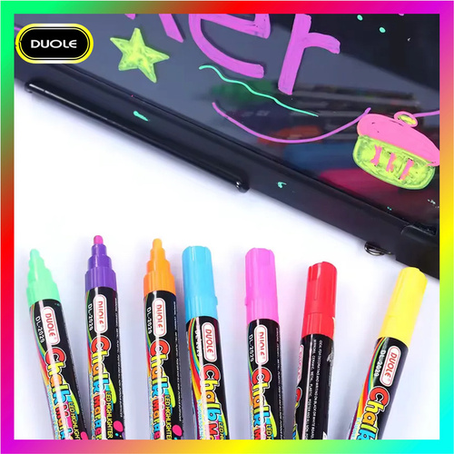 ماژیک Duole LED HIGHLIGHTER جوهر گچ مایع یا liquid chalk با رنگ های درخشان و فلورسنت است که برای نقاشی و یا نوشتن، ایده آل برای تمامی رده های سنی از کودک تا بزرگسال می باشد. این محصول در رنگ های مختلف فلورسنت که همگی براق هستند، تجربه منحصر بفردی برای کاربر به همراه دارد. ماژیک های گچی مایع که به ماژیک گلس برد نیز معروف هستند، از نوع WET-ERASE می باشند؛ به این معنا که برای پاک کردن باید از دستمال خیس یا مرطوب استفاده شود.