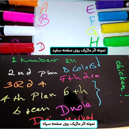 علاوه بر این که این ماژیک ها بر روی تمامی وایت بردها و انواع تخته های سیاه و سفید (روکش دار PET یا PVC) قابل نوشتن و پاک شدن هستند، همچنین بر روی انواع صفحات LED , پلکسی، شیشه ها، پنجره، درها، شیشه های حبوبات، شیشه های ماشین، تگ های قیمتی فروشگاهی و ... نیز قابل نوشتن و پاک شدن هستند. این ماژیک ها بر روی سطوح صیقلی مانند آینه و شیشه براحتی با آب پاک و شسته می شوند، ولی برای سطوح porous یا کاغذی متفاوت است و به دلیل نفوذ در بافت کاغذی، ماندگار خواهد بود. بنابراین قبل از نوشتن بر روی هر گونه سطحی، ابتدا از قابلیت پاک شدن آن مطمئن شوید. ماژیک بر پایه آب است.